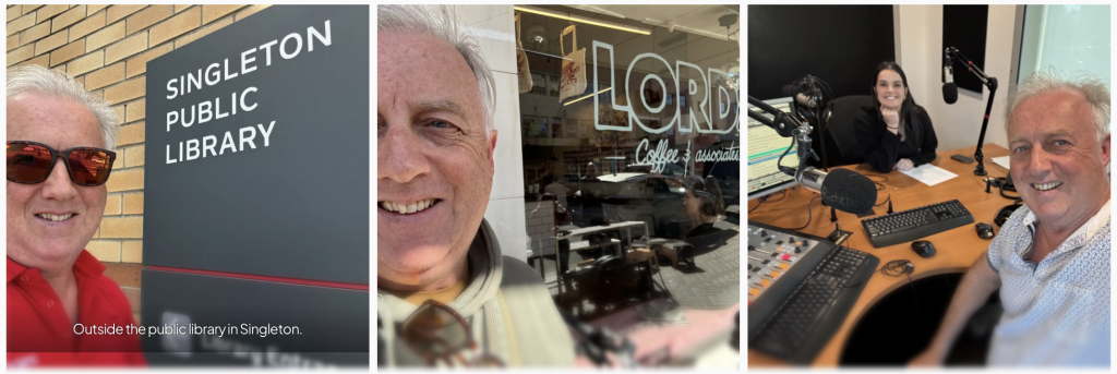 These three pictures below show me in different places or contexts. In one, I am in the studio, in another, I am outside a public library, in the regional town of Singleton. The third and final picture places me outside a coffee shop (leaning into its name, and my own sense of faith and spirituality, I wanted to make a joke about me doing ‘the Lord’s work’!)